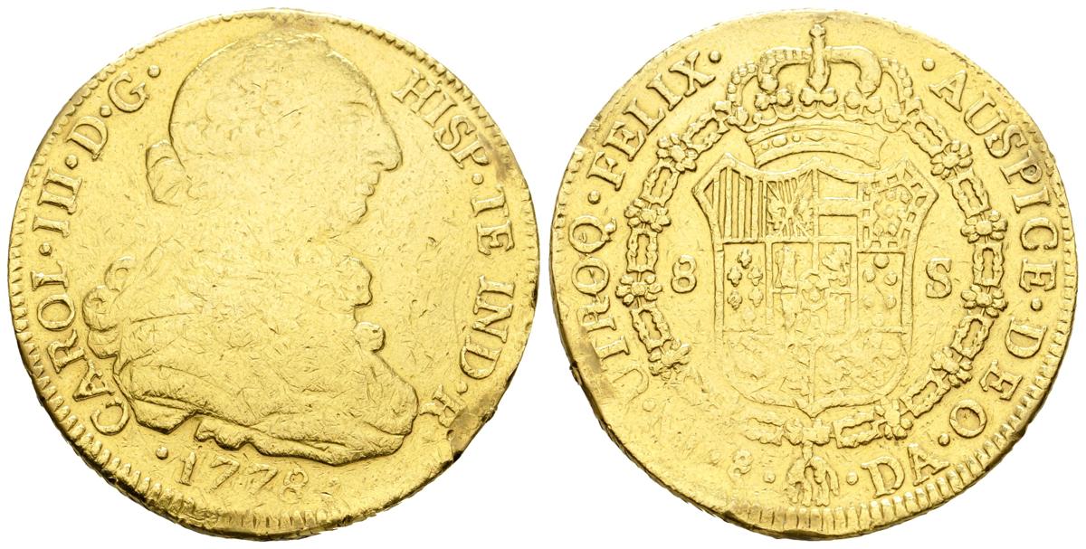 CARLOS III. 8 Escudos. 1778. Santiago DA, variante HISP. TE. en lugar de ET y la A del ensayador rectificada. Vi-1716 vte. Au. 26,97gr. Sirvió como joya, soldaduras limadas en el canto. BC+/MBC-. Rara.