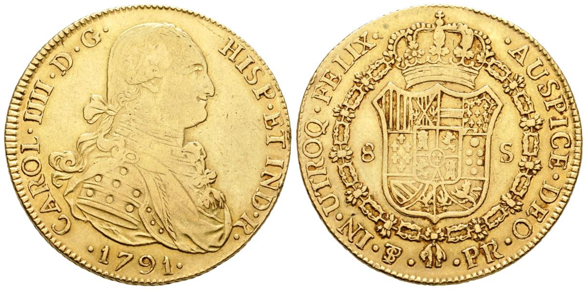 CARLOS IV. 8 Escudos. 1791. Potosí PR. Primer año de busto propio. Esta pieza es más rara que la de busto laureado del mismo año. Cal-97; Cal-Onza 1089. Au. 26.96gr. MBC-.