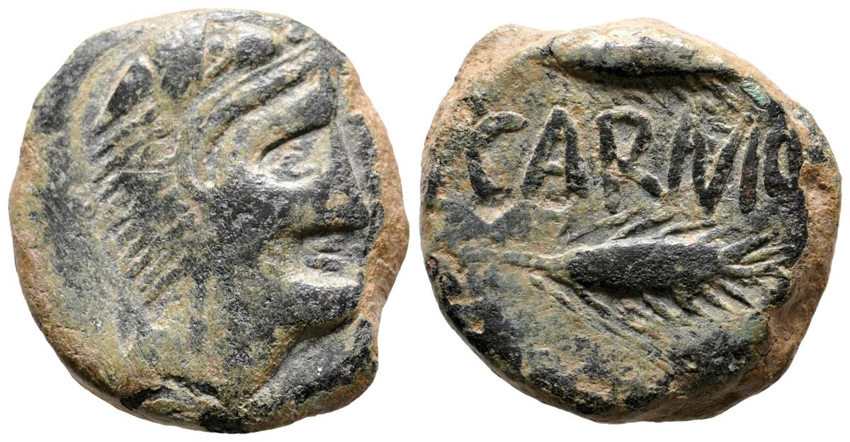 CARMO. As. 80 a.C. Carmona (Sevilla) A/ Cabeza de Hércules a derecha. R/ Dos espigas a derecha, entre ambas CARMO. FAB-466 como semis. Ae. 20,40g. MBC-.