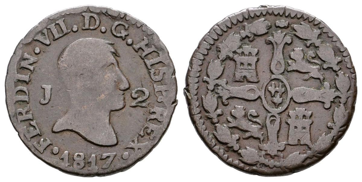 FERNANDO VII. 2 Maravedís. 1817. Jubia J. Cal-1582. Busto no laureado. Ae. 2,52g. BC+. Escasa.