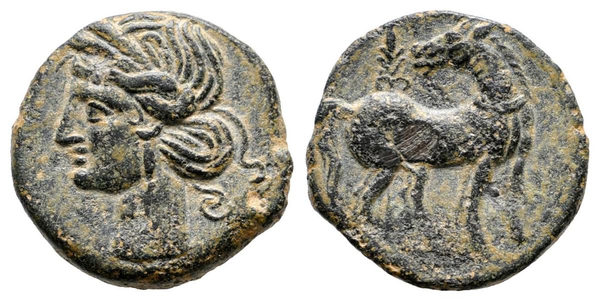 CARTAGONOVA. Calco. 220-215 a.C. Cartagena (Murcia). A/ Cabeza de Tanit a izquierda. R/ Caballo parado a derecha con la cabeza vuelta, detrás palmera. FAB-503. Ae. 7,14g. EBC-.