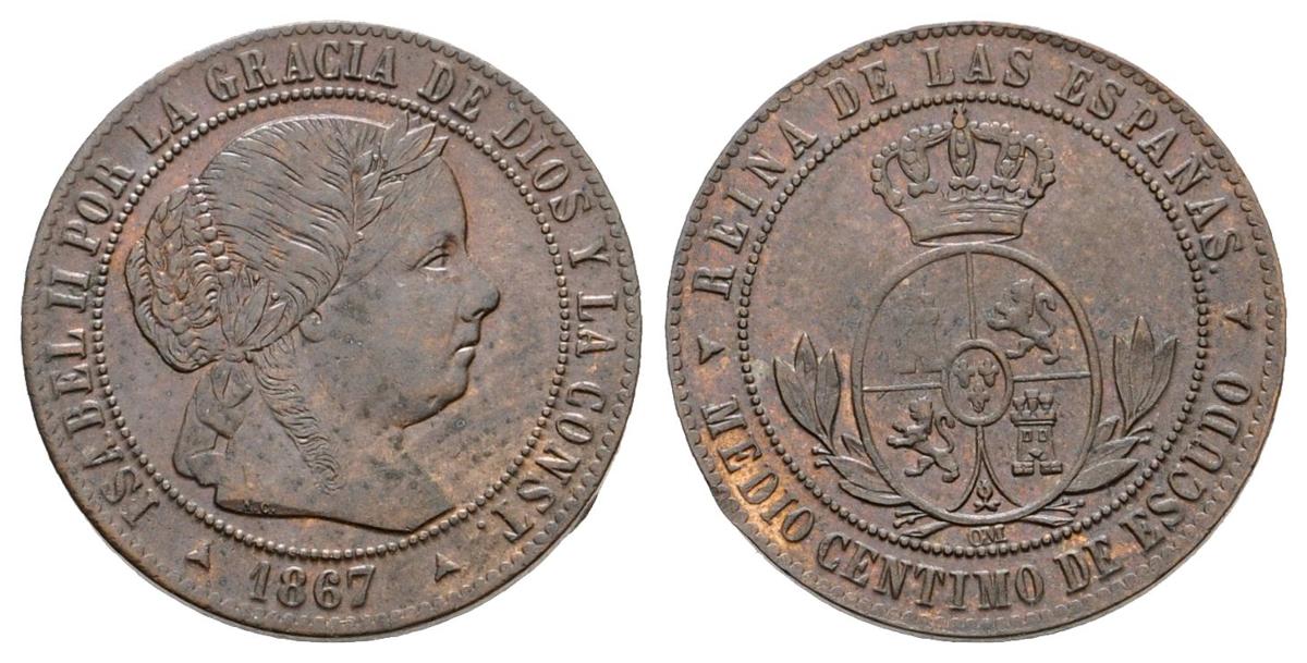 ISABEL II. 1/2 Céntimo de escudo. 1867. Segovia OM. Cal-677. Ae. 1,33g. EBC+.