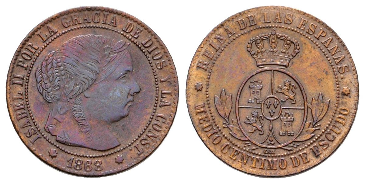 ISABEL II. 1/2 Céntimo de escudo. 1868. Sevilla OM. Parte del busto incuso en el reverso. Cal-680. Ae. 1,23g. Pátina irisada. EBC+.