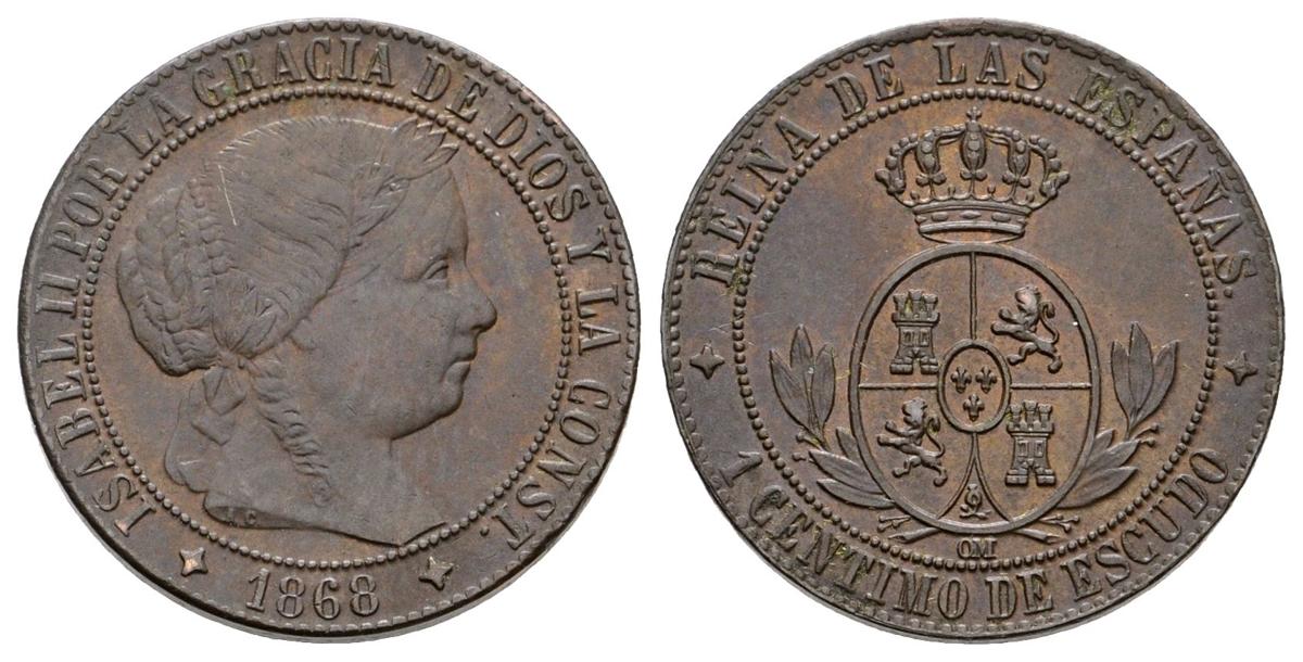 ISABEL II. 1 Céntimo de escudo. 1868. Jubia OM. Cal-659. Ae. 2,45g. EBC-.