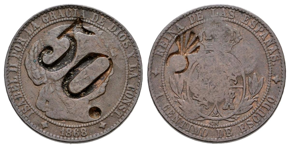 ISABEL II. 1 Céntimo de Escudo. 1868. Jubia OM. Contramarca Nº50 en anverso y bomba de artillería en reverso. Cal-674. Ae. 2,49g. BC+. Muy escasa.