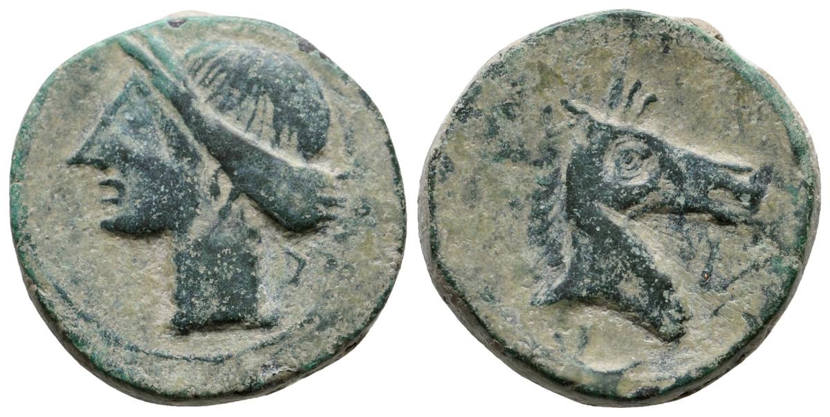 CARTAGONOVA. Calco. 220-215 a.C. Cartagena (Murcia). A/ Cabeza de Tanit a izquierda. R/ Cabeza de caballo a derecha delante letra púnica. FAB-515. Ae. 9,73g. MBC+ .