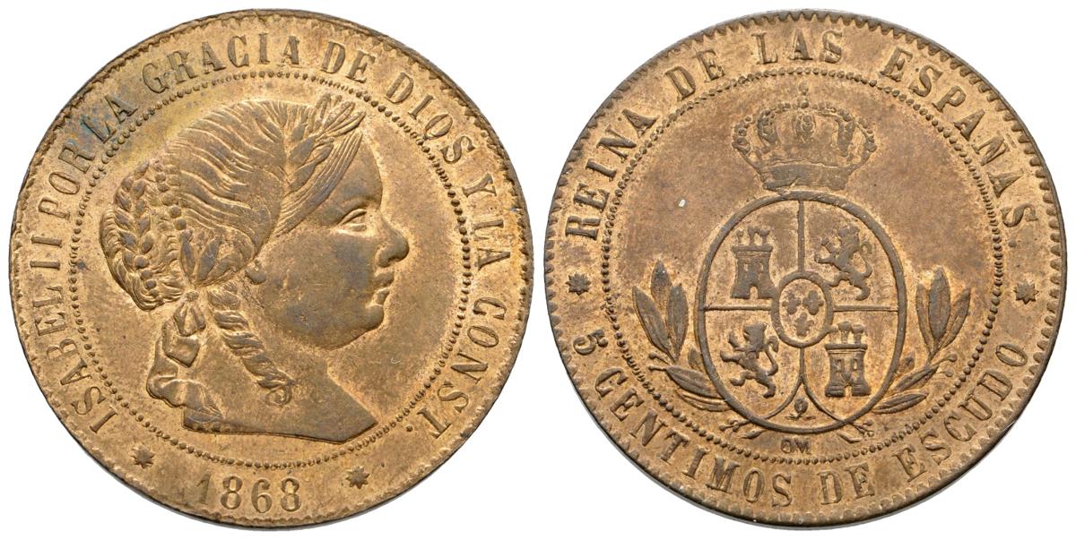 ISABEL II. 5 Céntimos de escudo. 1868. Barcelona OM. Cal-625. Ae. 11,75g. Brillo original. EBC-.