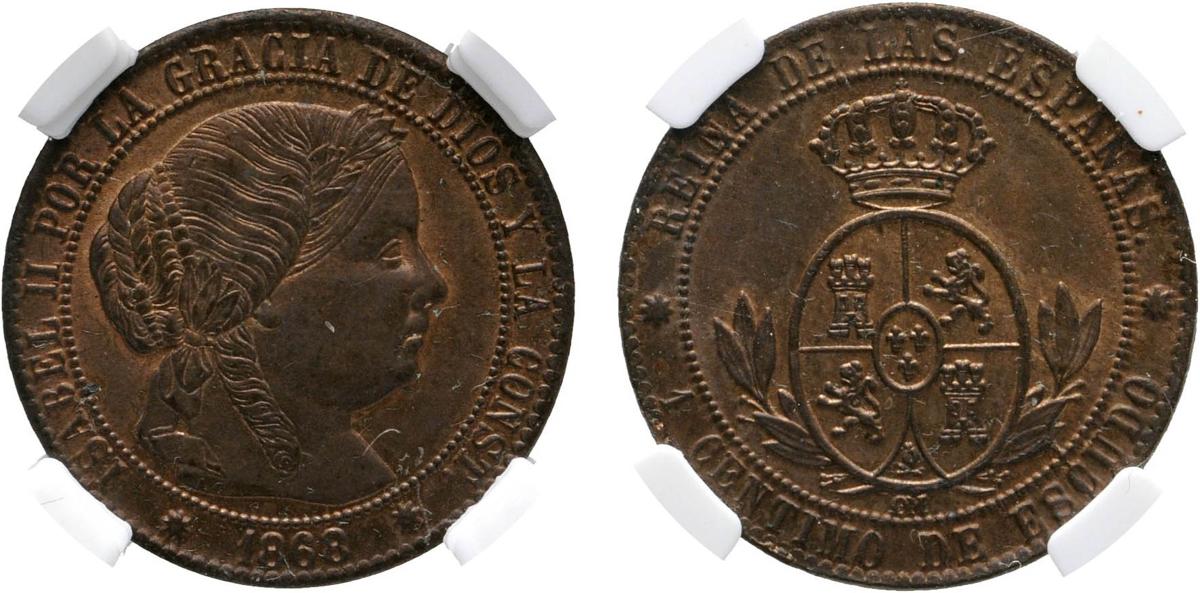 ISABEL II. 1 Céntimo de Escudo. 1868. Barcelona OM. Encapsulada por NN-Coins como Ms 64. Cal-628. Ae. Brillo original. SC.