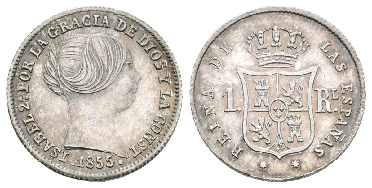 ISABEL II. 1 Real. 1855/4. Sevilla. Rara rectificación. Cal-400 var. Ar. 1,29g. Bonita pátina. EBC-.