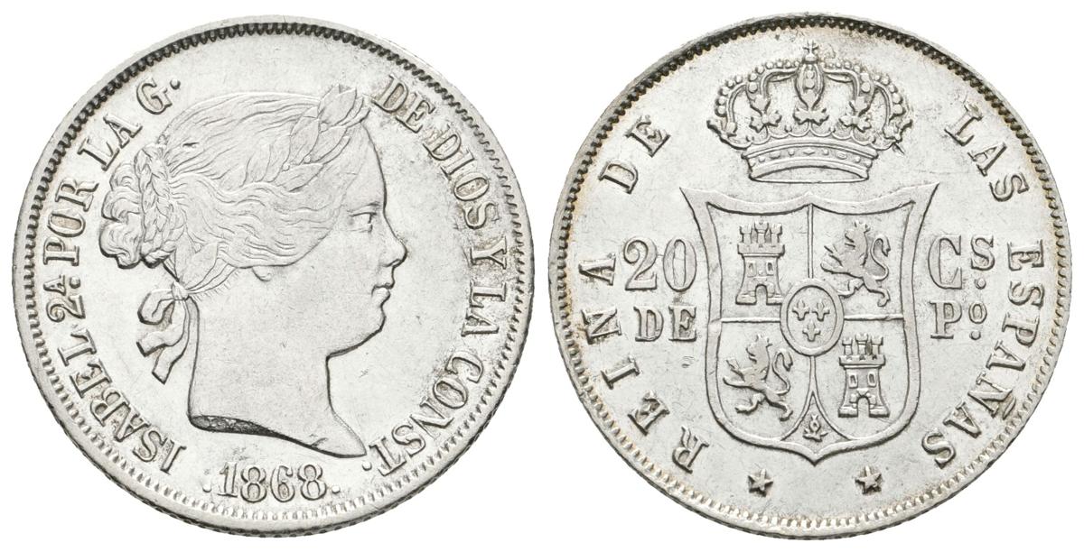ISABEL II. 20 Centavos de peso. 1868. Manila. Cal-460; Basso 51. Ar. 5,11g. Golpecitos. MBC+/MBC.