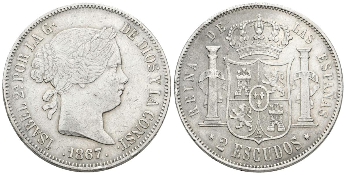 ISABEL II. 2 Escudos. 1867. Madrid. Cal-204. Ar. 25,90g. MBC+.