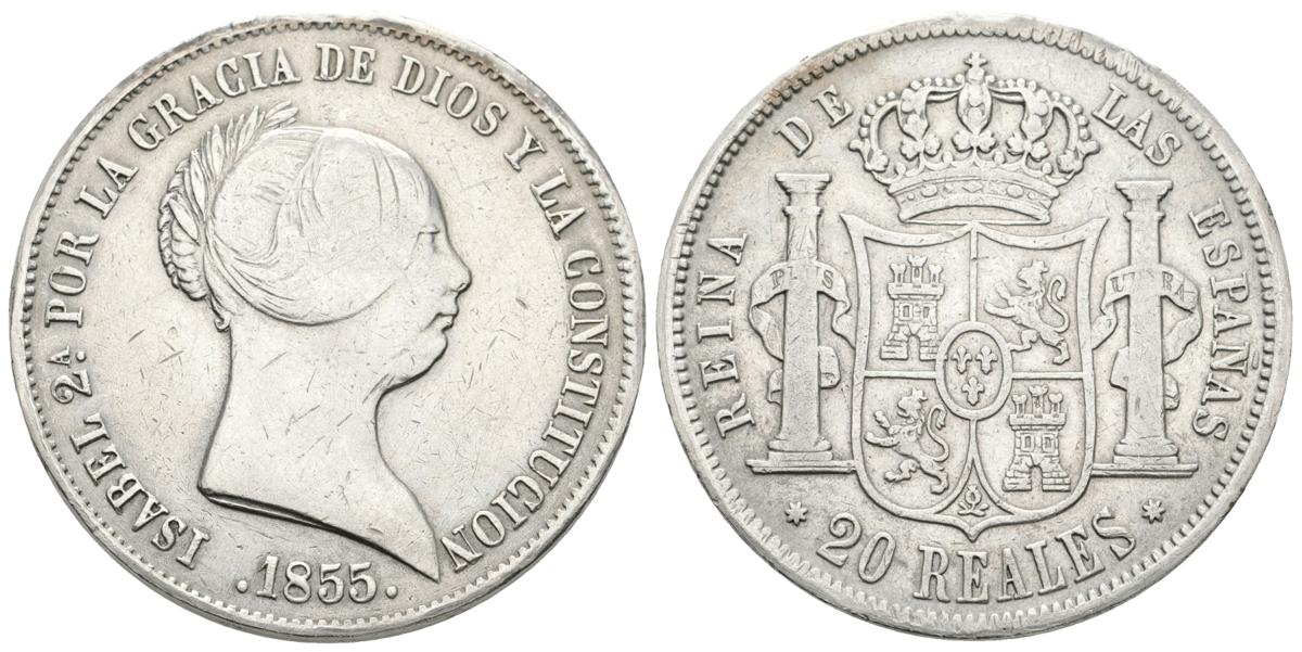 ISABEL II. 20 Reales. 1855. Sevilla. Cal-193. Ar. 25,79g. MBC-.
