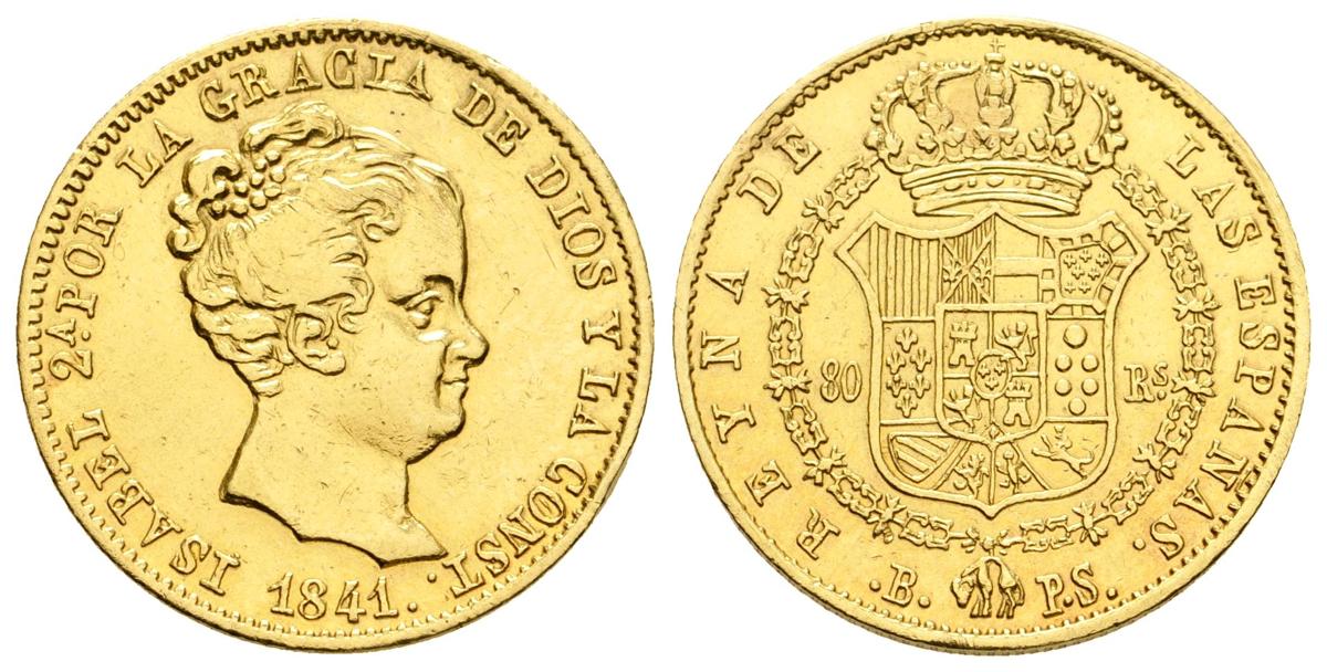 ISABEL II. 80 Reales. 1841. Barcelona PS. Cal-58. Au. 6,71gr. Agujero tapado. MBC-.