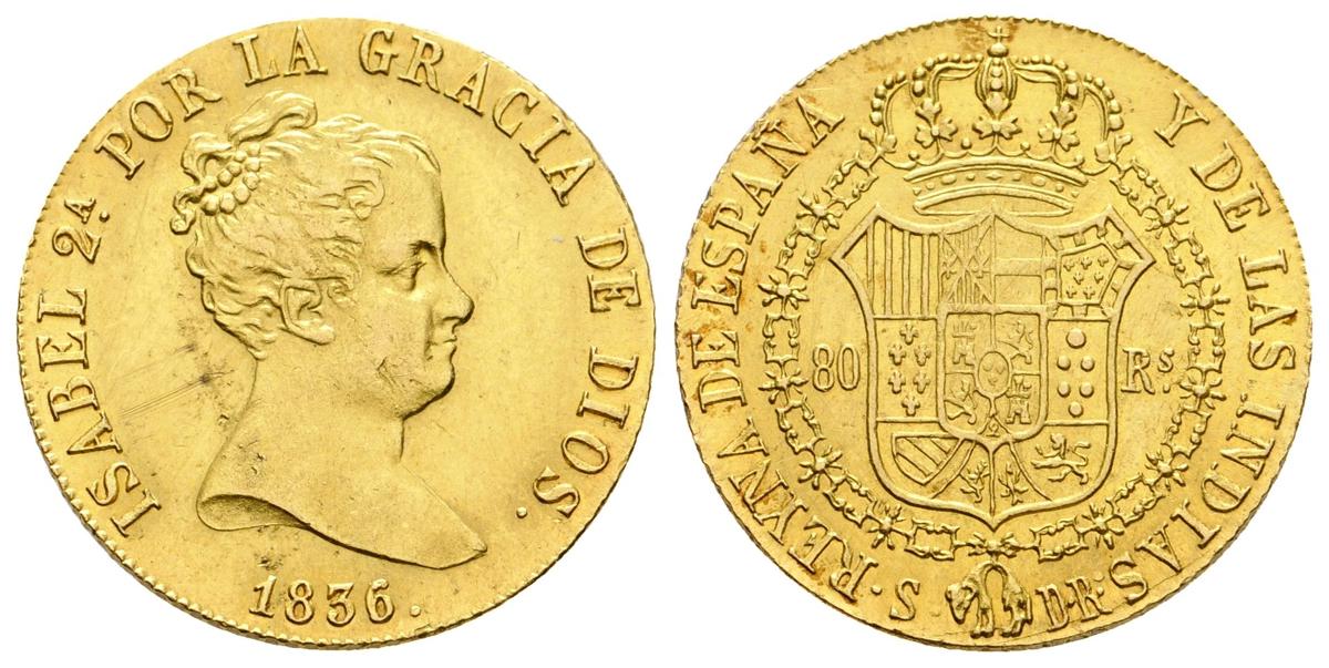 ISABEL II. 80 Reales. 1836. Sevilla DR. Cal-84. Au. 6,82g. Brillo original, dos rayitas en anverso. EBC. Escasa.