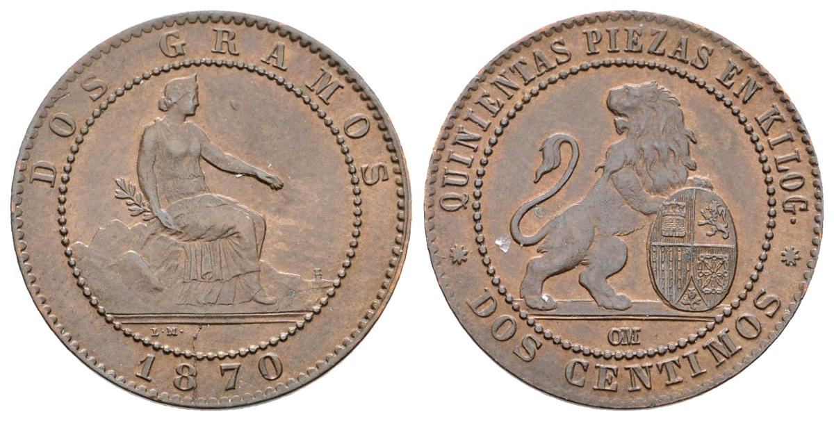 GOBIERNO PROVISIONAL. 2 Céntimos. 1870. Barcelona OM. Cal-26. Ae. 2,06g. EBC+.