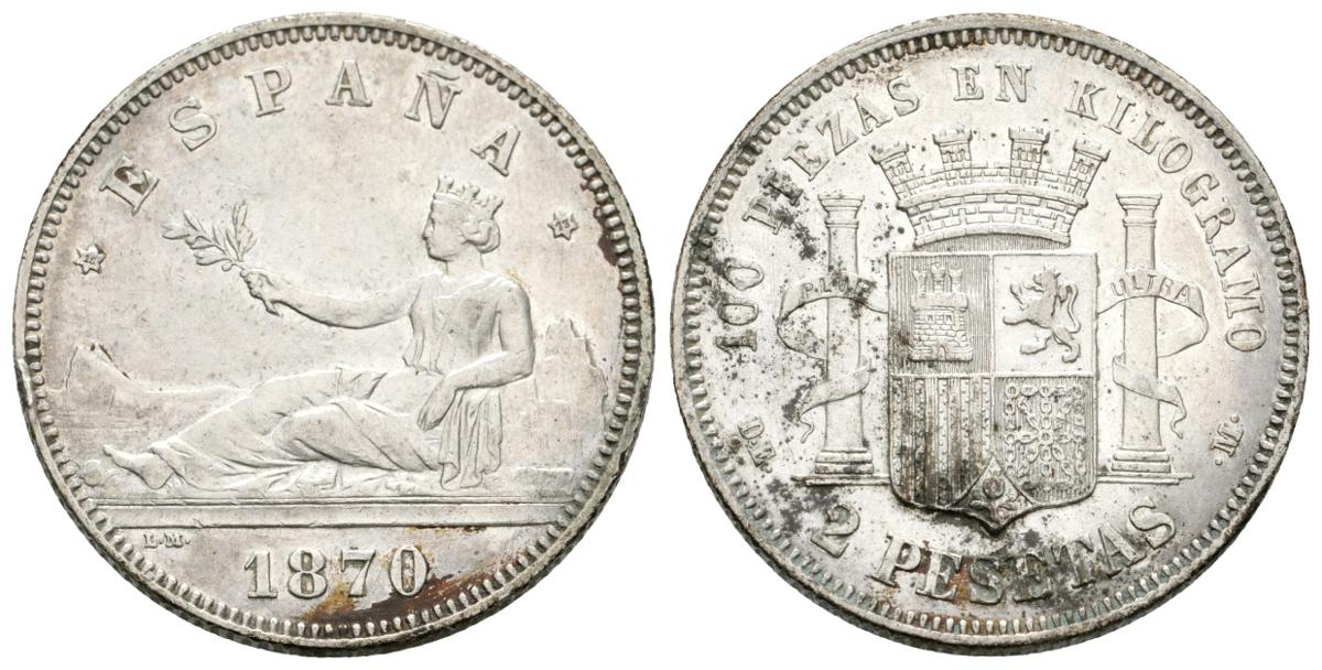 GOBIERNO PROVISIONAL. 2 Pesetas. 1870 *18-73. Madrid DEM. Cal-9. Ar. 9,94g. Algo sucia y golpe en el canto. EBC-/MBC+.