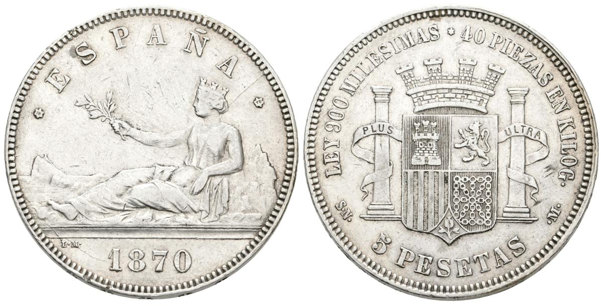 GOBIERNO PROVISIONAL. 5 Pesetas. 1870 *18-70. Madrid SNM. Cal-3. Ar. 24,96. Rayitas. MBC.