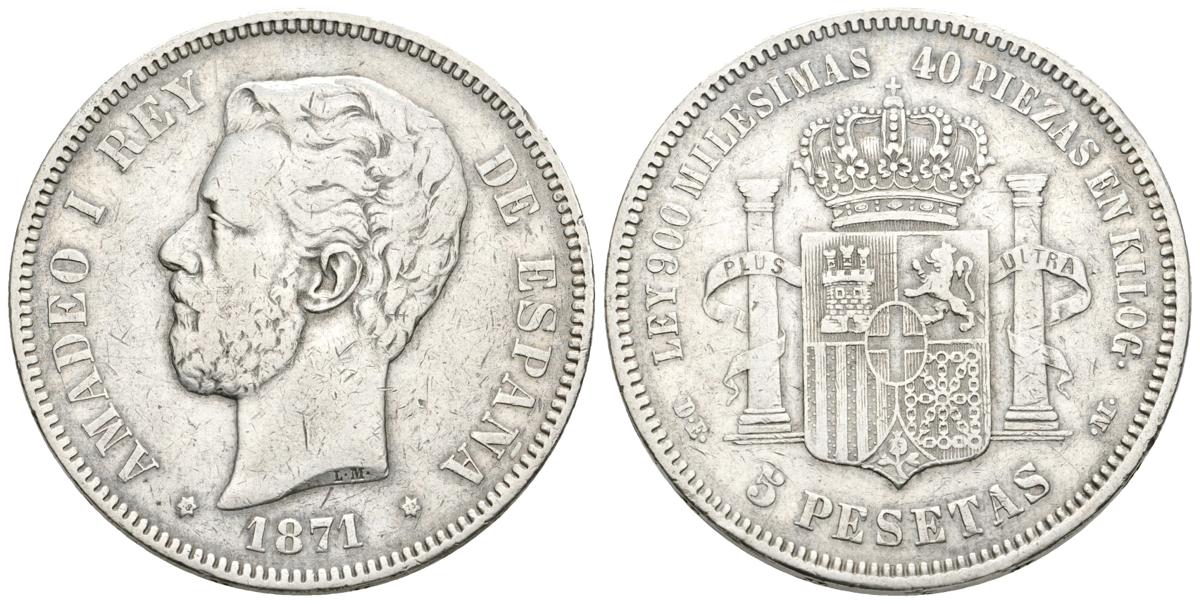 AMADEO I. 5 Pesetas. 1871 *18-73. Madrid DEM. Cal-9. Ar. 24,65g. MBC-. Muy escasa.