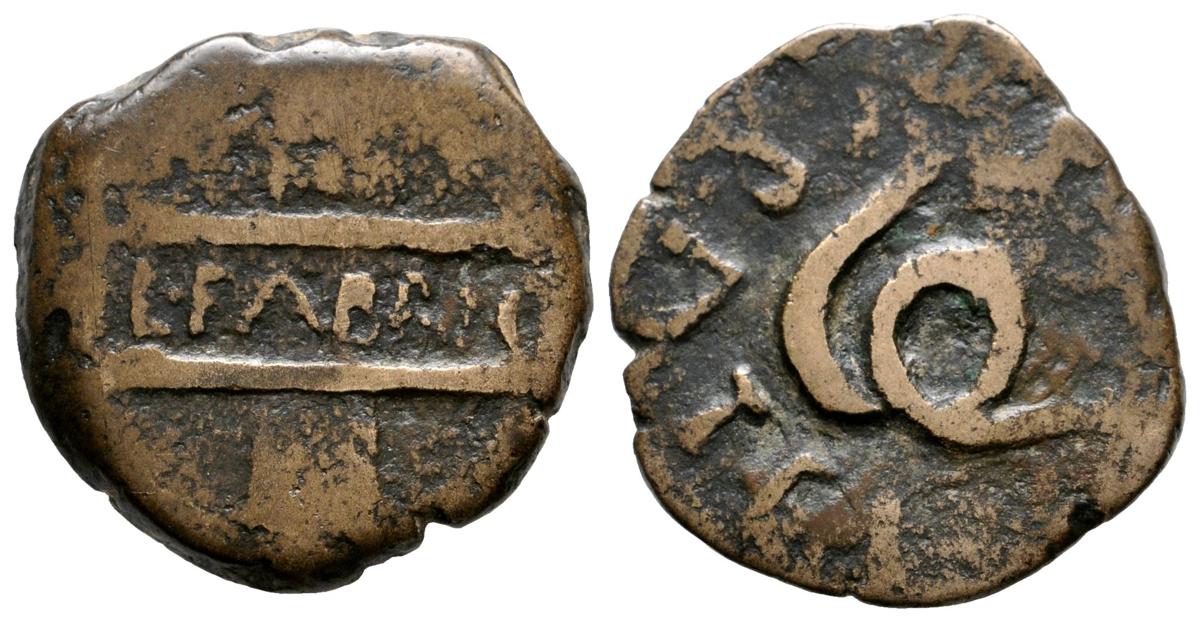 CARTAGONOVA. Semis. 50-30 a.C. Cartagena (Murcia). A/ Cartela conteniendo L. FABRIC. R/ Serpiente, alrededor P. ATELIV. FAB-569. Ae. 6,49g. BC+.