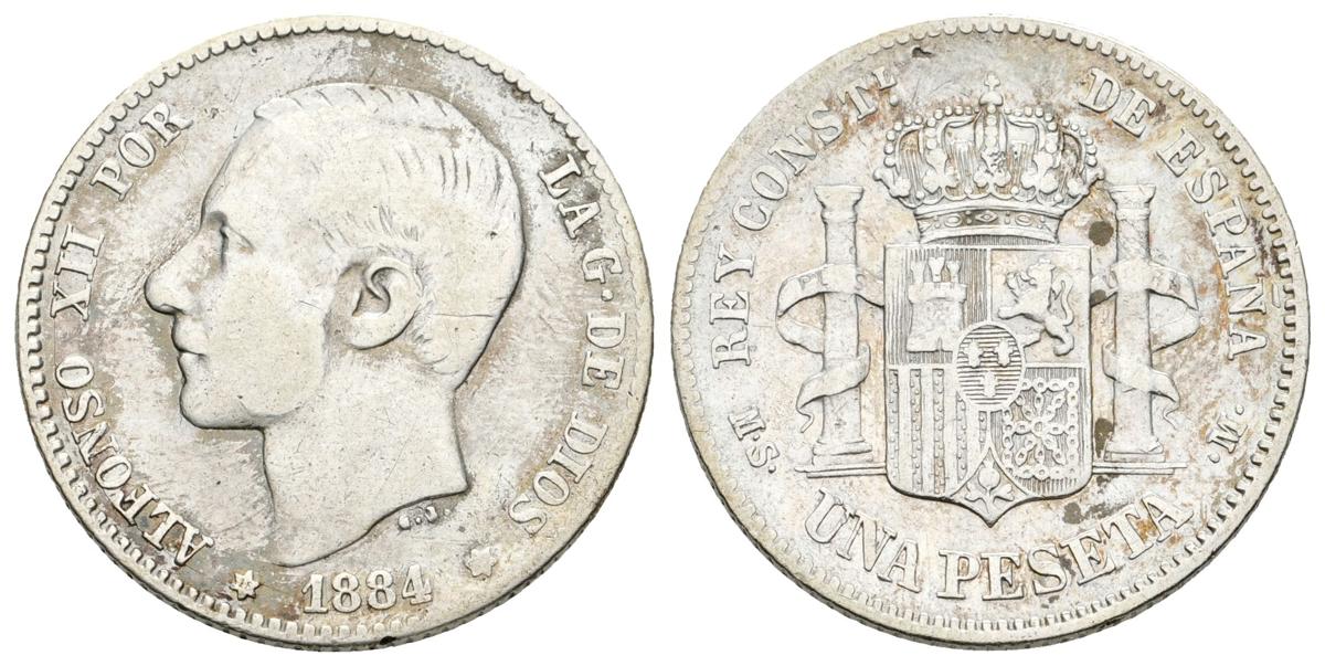 ALFONSO XII. 1 Peseta. 1884 *18-__. Madrid MSM. Cal-60. Ar. 4,86g. BC+/MBC-. Rara.