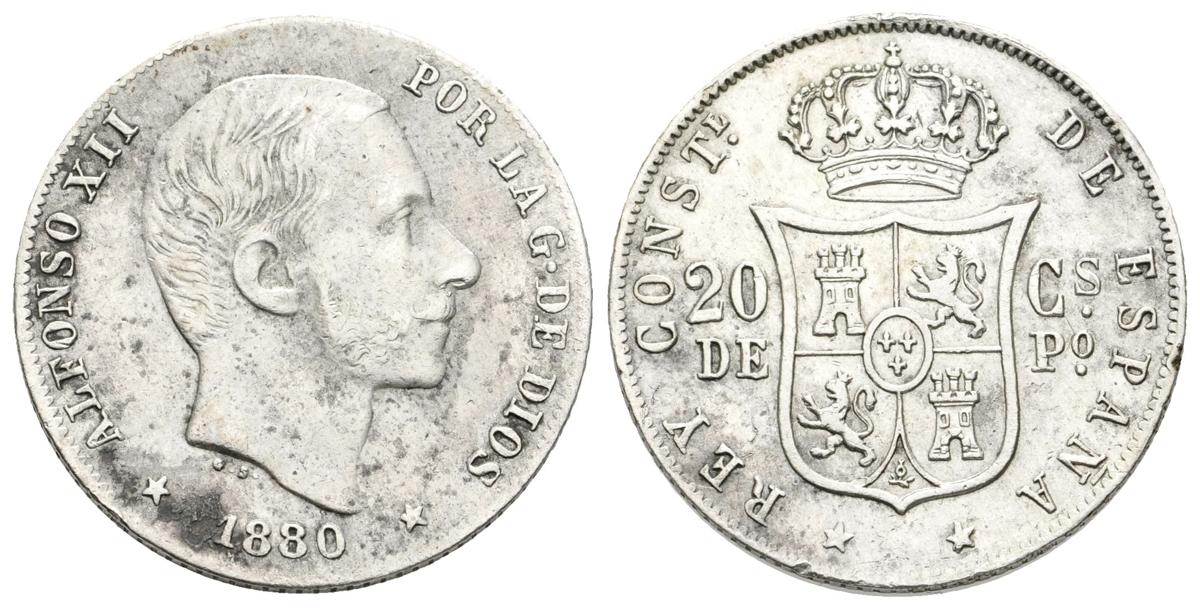 ALFONSO XII. 20 Centavos de Peso. 1880. Manila. Cal-57. Ar. 5,05g. MBC. Escasa.