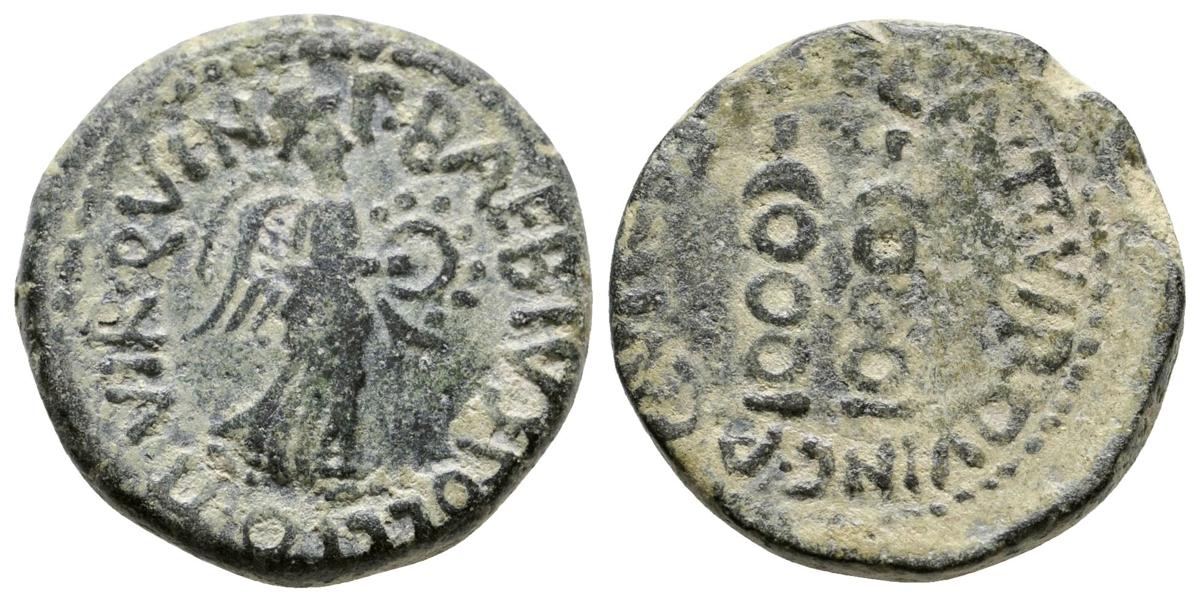 CARTAGONOVA. Semis. Epoca de Augusto. 27 a.C.-14 d.C. Cartagena (Murcia). A/ Victoria a derecha. P. BAEBIVS POLLIO II VIR. QVIN. R/ Insignias militares. C. AQVINVS MELA II VIR. QVIN. FAB-580. Ae. 6,96g. MBC/MBC+.