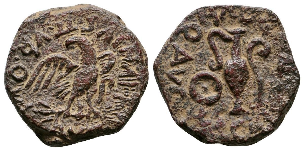 CARTAGONOVA. Semis. Epoca de Augusto. 27 a.C.-14 d.C. Cartagena (Murcia). A/ Aguila sobre rayos, alrededor L. IVNIVS II. VIR. QVINQ. AVG. R/ Objetos ceremoniales, alrededor L. ACILIVS II. VIR. QVINQ. AVG. FAB-583. Ae. 5,85g. MBC+.