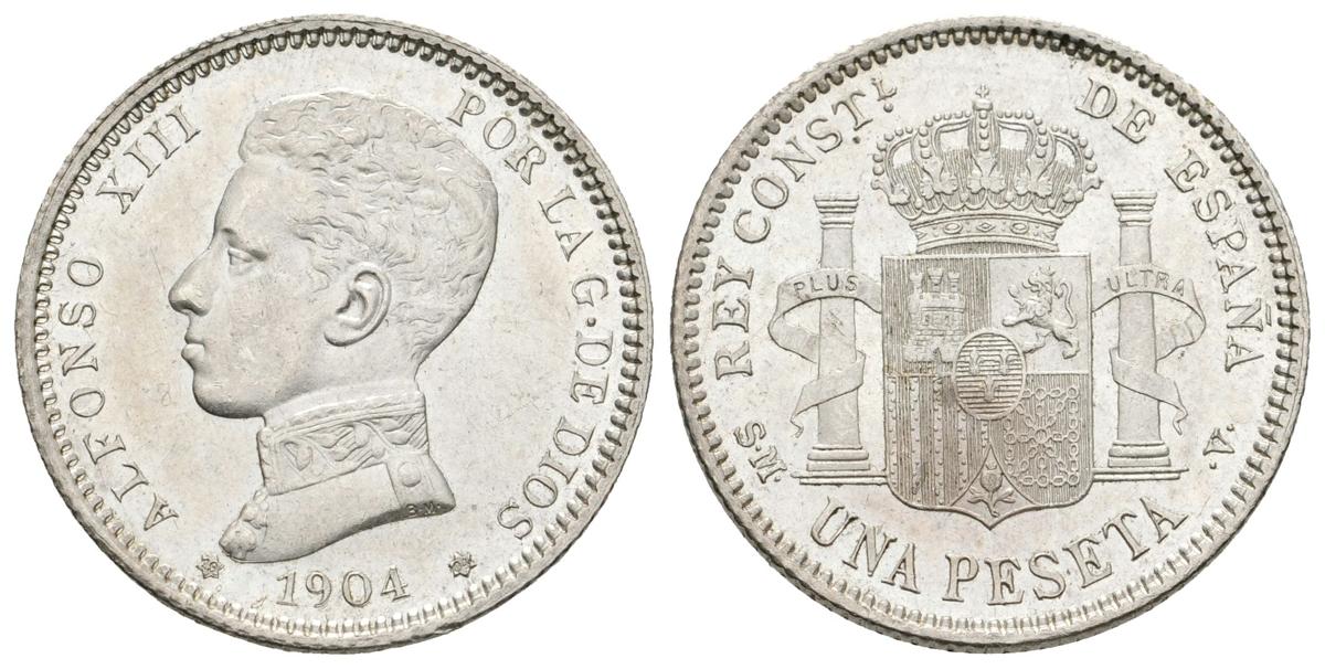ALFONSO XIII. 1 Peseta. 1904 *19-04. Madrid SMV. Cal-50. Ar. 4,93g. Brillo original y mínimas marquitas en anverso. SC-.