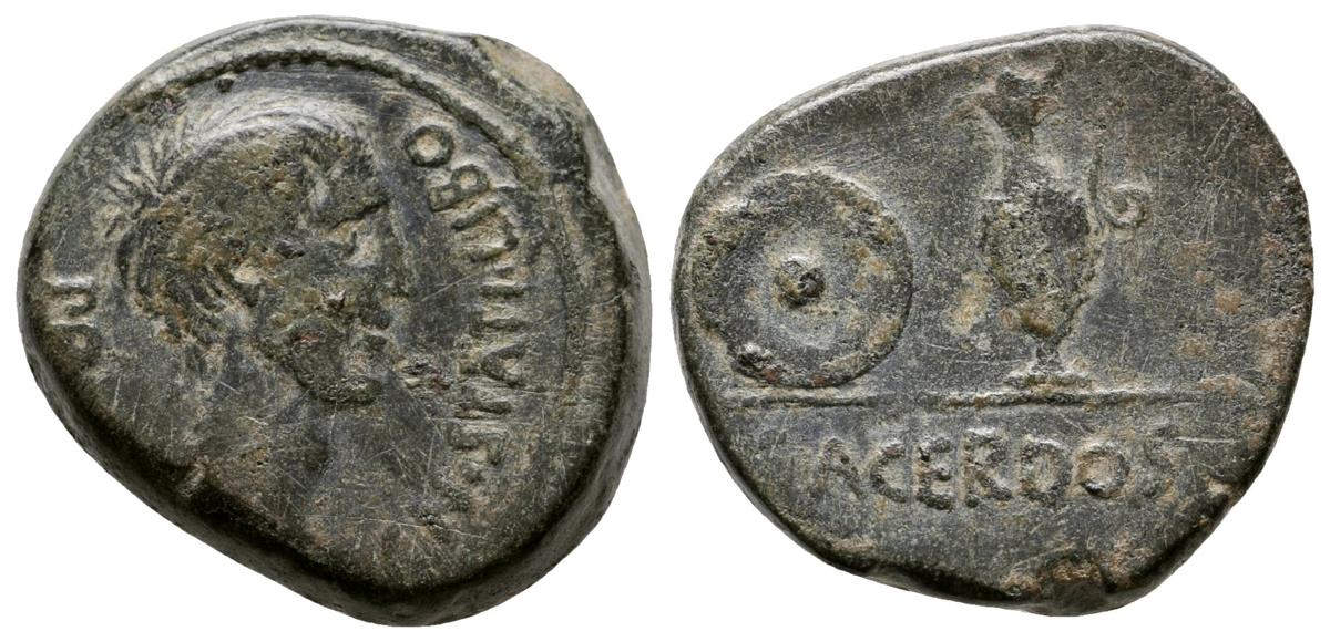 CARTAGONOVA. Semis. Epoca de Augusto. 27 a.C.-14 d.C. Cartagena (Murcia). A/ Cabeza de ¿Agrippa? a derecha. CN. STATI. LIBO. PRAEF. R/ Pátera y praefericulo. SACERDOS. FAB-587. Ae. 9,21g. MBC+.