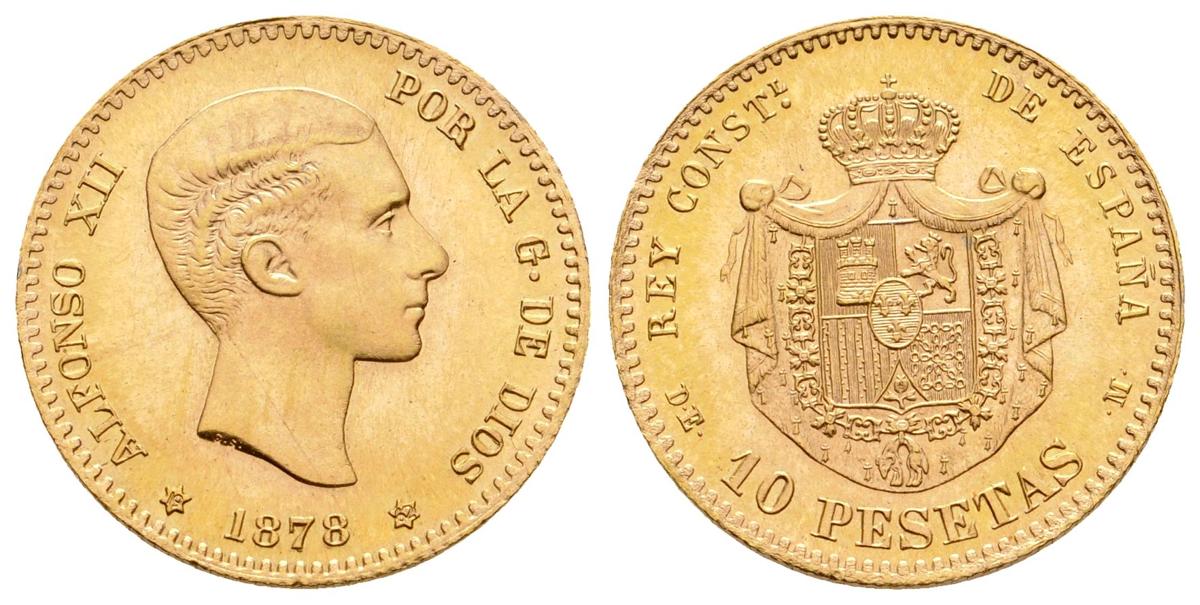 ALFONSO XII. 10 Pesetas. 1878 *19-62. Madrid DEM. Reacuñación oficial. Cal-10. Au. 3,23g. SC.