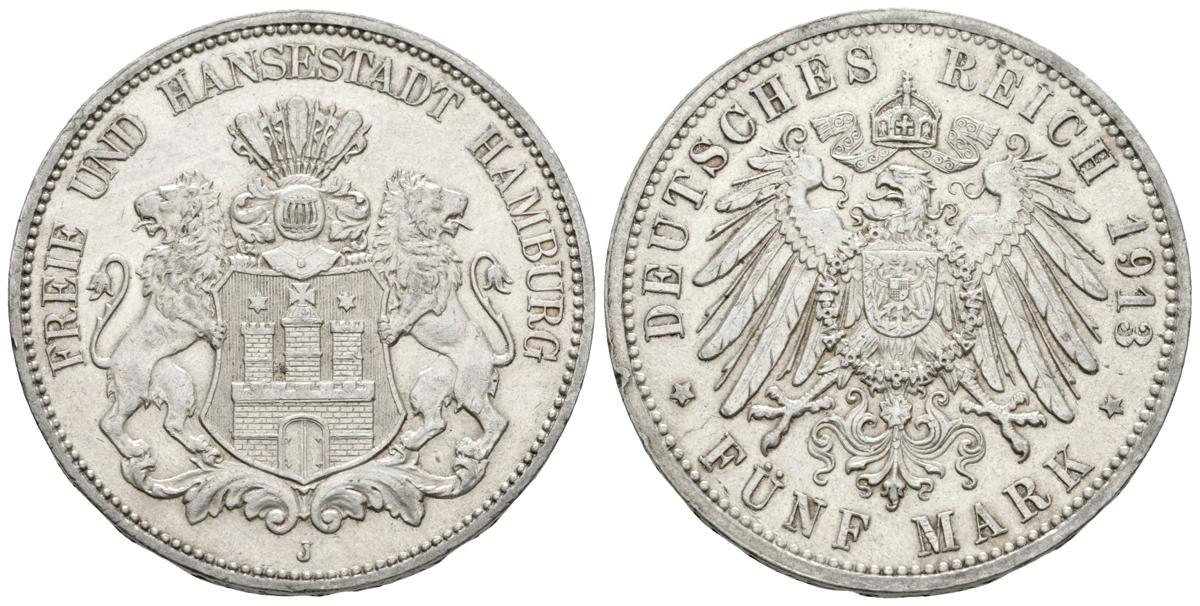 ALEMANIA. Estado libre. 5 Marcs. 1913. Hamburg J. Km#293. Ar. 27,73g. MBC+.