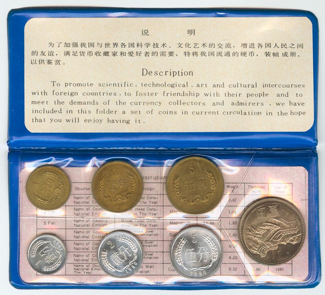 CHINA. República Popular. Estuche oficial con serie completa de Fen a Yuan 1980 y medalla adicional de la Gran Muralla. Presentado en carpeta de vinilo azul con monedas enfundadas selladas y documentos de identificación. KM#1-3/15-18. Suave tono. PROOF. Muy raro.