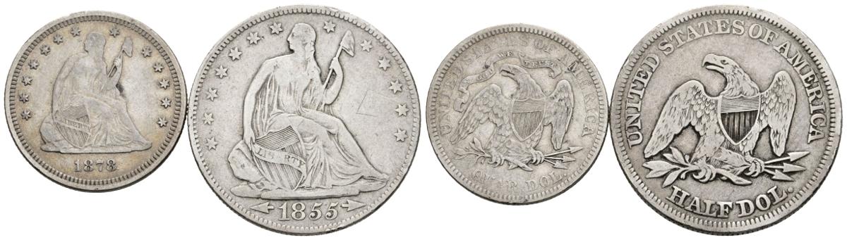 ESTADOS UNIDOS. ¼ de Dollar. 1878. Km#A98 y ½ Dollar. 1855. Km#8. Ar. MBC/MBC-. A EXAMINAR.