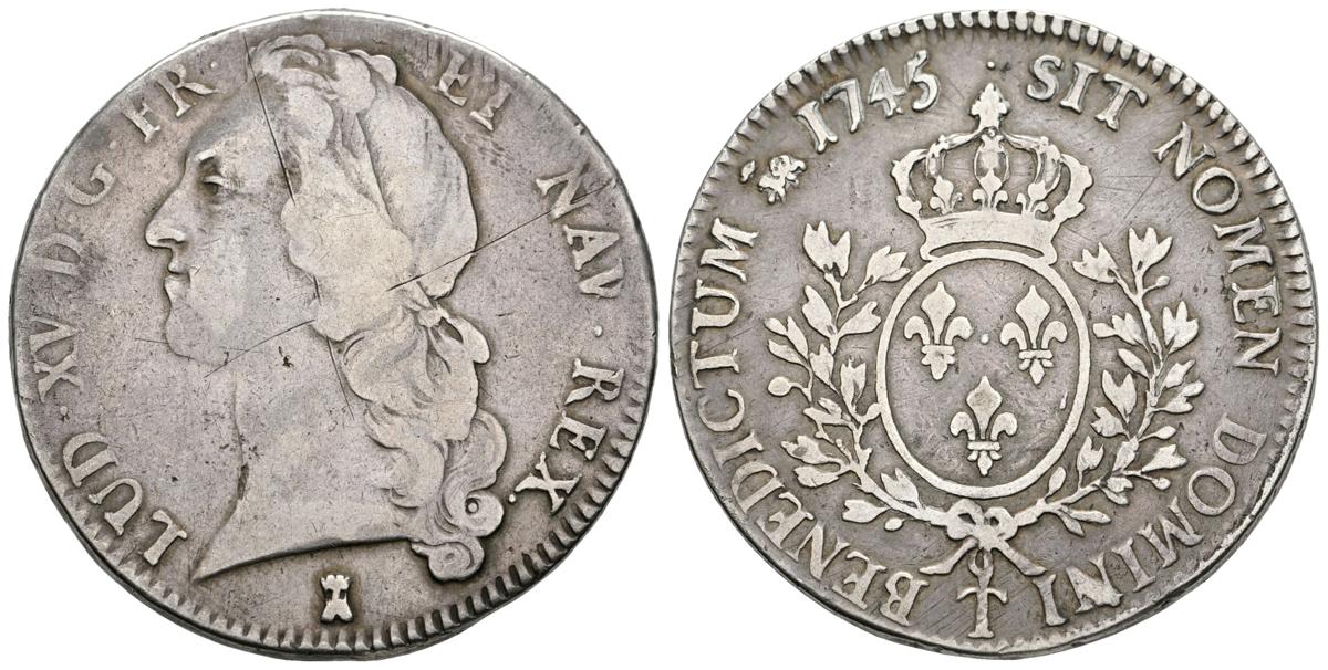 FRANCIA. Louis XV. Ecu. 1745. Nantes T. KM#512.20. Ar. 28,86g. Rayitas. MBC-.