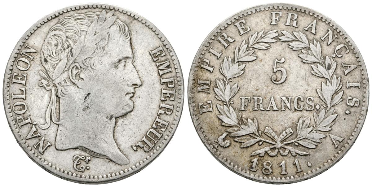 FRANCIA. Napoleón. 5 Francs. 1811. Paris A. Km#694.1. Ar. 24,91g. MBC.
