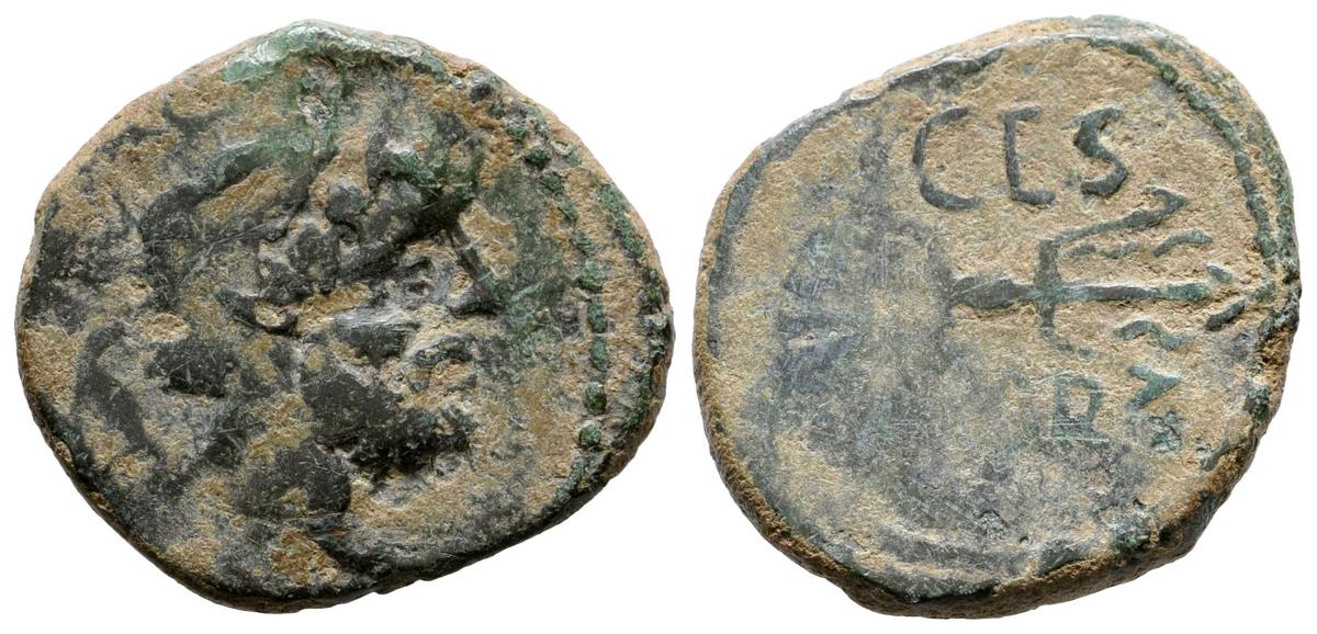 CARTEIA. Semis. 80-20 a.C. San Roque (Cadiz). A/ Cabeza de Júpiter a derecha, detrás S. R/ Fulmen, encima CAES, debajo CAR. FAB-653. Ae. 5,82g. MBC-.