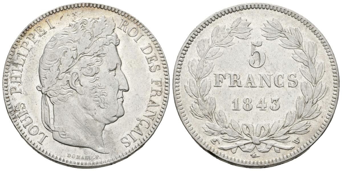 FRANCIA. Louis Felipe I. 5 Francs. 1843. Lille K. Km#749.13. Ar. 24,83g. Rayitas en anverso. MBC.