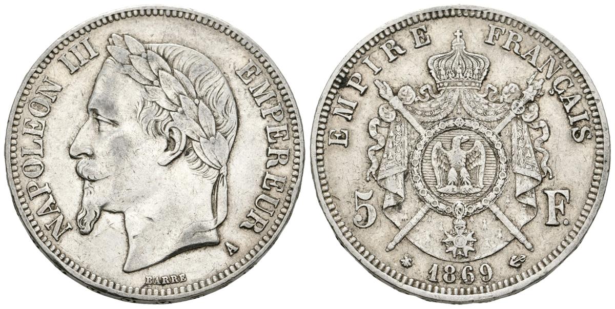 FRANCIA. Napoleón III. 5 Francs. 1869. Paris A. 24,91g. Km#799.1. Ar. MBC.