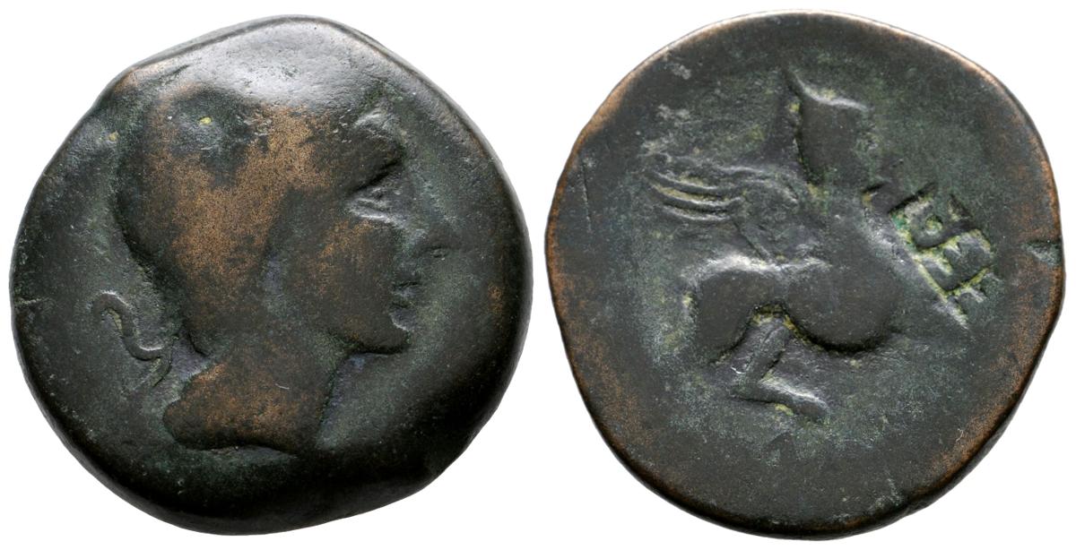 CASTULO. As. 180 a.C. Cazlona (Jaén) A/ Cabeza masculina diademada a derecha R/ Esfinge avanzando a derecha, delante estrella, debajo leyenda curva KaSTiLO, con contramarca FER (Mª García Bellido 2004-236 lo interpreta como sello minero con el significado FERraria Herrería) FAB-695. Ae. 17,45g. MBC-. Escasa.