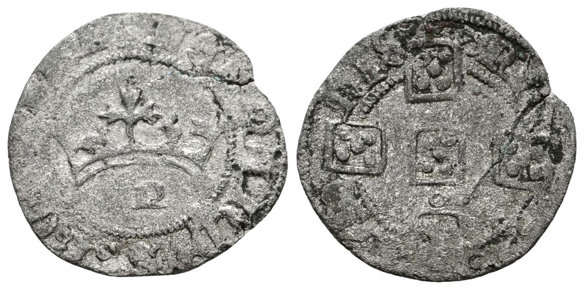 PORTUGAL. Fernando I. Pilarte Cruzado. (1367-1383). Roel bajo el primer escudo. Gomes 08.03 j/o. Ve. 1,16g. Grieta. MBC-. Ex. Col. M. Mozo Monroy.