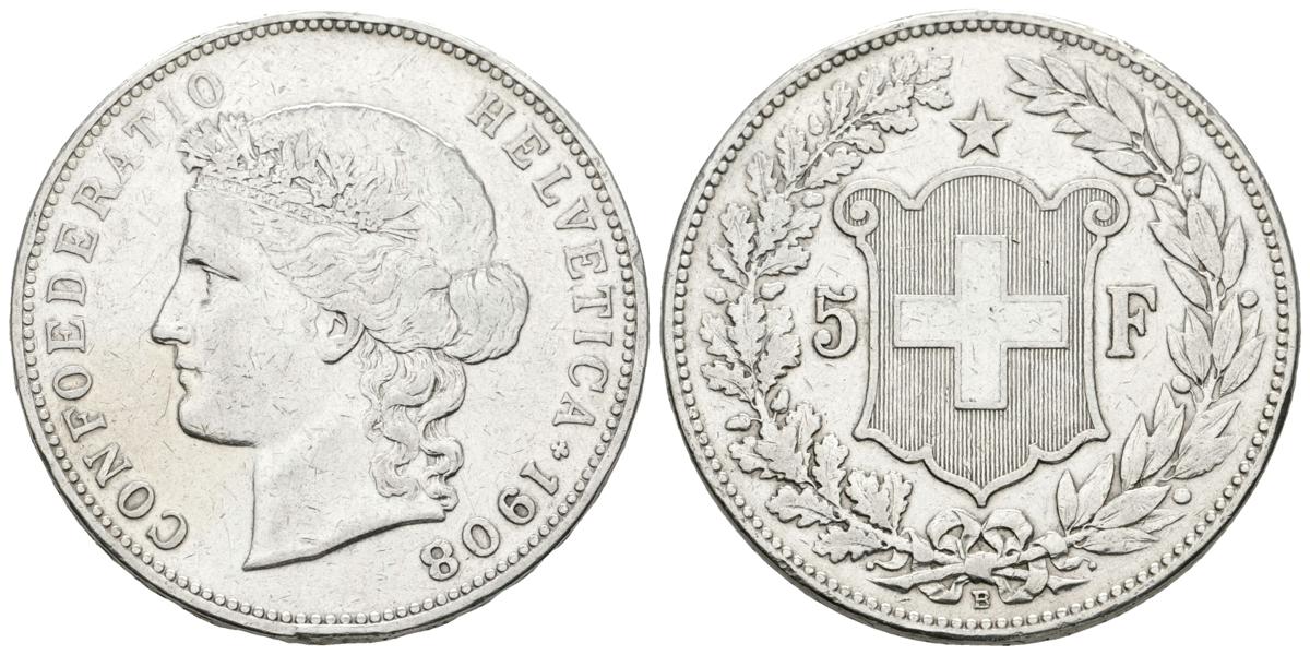 SUIZA. 5 Francs. 1908. Bern B. Km#34. Ar. 24,93g. (Rayitas). MBC-. Escasa.