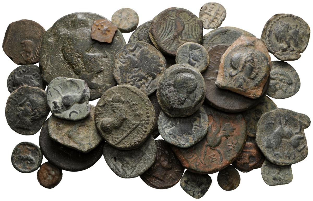 HISPANIA ANTIGUA. Lote de 36 monedas de diferentes módulos (As, Semis, Cuadrantes y Sextantes) y cecas: Colonia Rómula, Arse, Málaca, Ebusus, Massalia, Carissa, Corduba, Itálica, Cástulo, Colonia Patricia y Obulco (Incluye semis Republicano). BC/MBC+. A EXAMINAR.