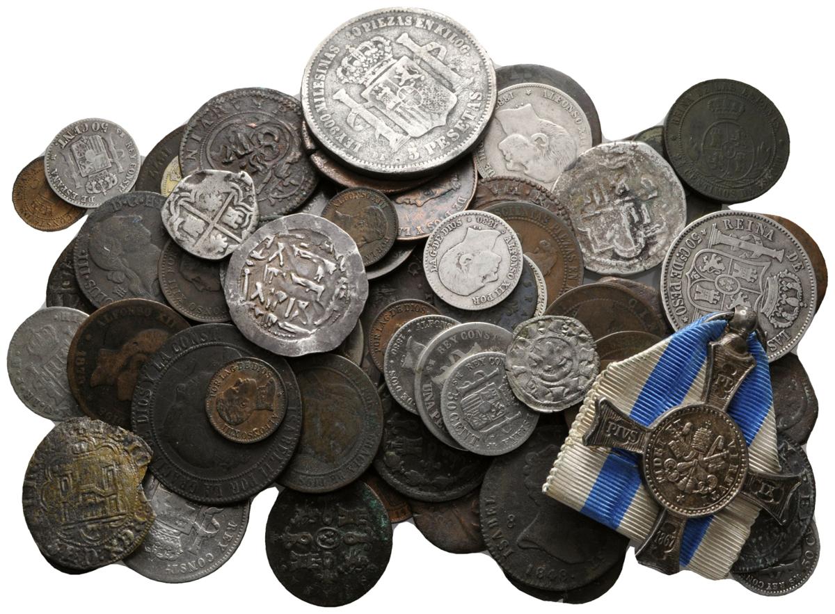 ESPAÑA. Lote compuesto por 70 monedas de Austrias y Borbones, incluyendo algunos vellones, Dirham, falsas de época, cartón moneda y medalla al mérito 1867 (Plata). A EXAMINAR.