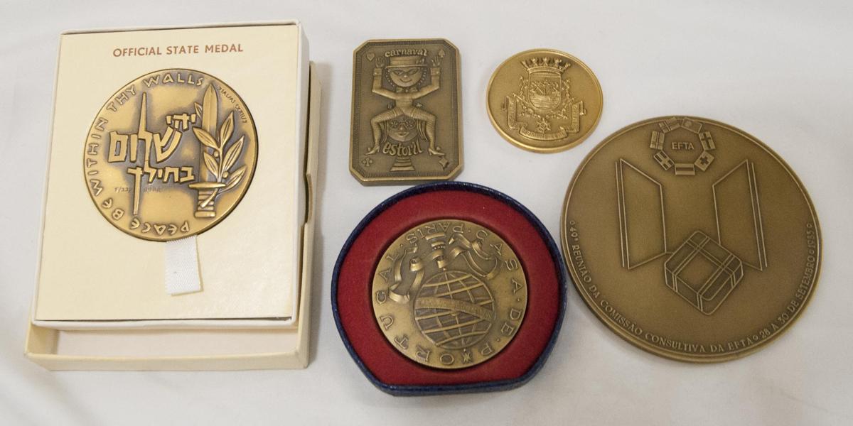 MUNDIAL. Lote compuesto por 22 Medallas de Portugal realizadas en bronce de diferentes medallas y formatos, representando diferentes temáticas (Carnaval, Aeronáutica, Deportes, Monumentos y Convenciones), Medalla de Israel en estuche original, 24 Billetes variados (España, China, Portugal y Marruecos) y caja conteniendo mas de tres kilos de monedas extranjeras y mayoritariamente de Estado Español. A EXAMINAR.