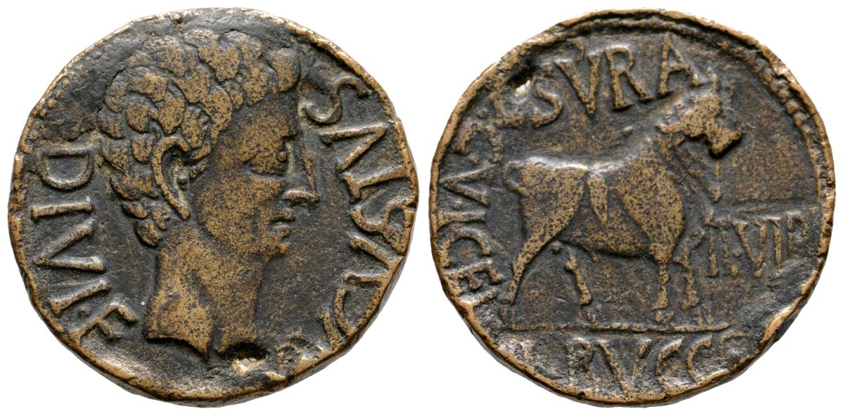 CELSA-KELSE. As. Epoca de Augusto. 27 a.C.-14 d.C. Velilla de Ebro (Zaragoza) A/ Cabeza de Augusto a derecha. AVGVSTVS.DIVI.F. R/ Toro parado a derecha, encima L.SVRA, debajo L.BUCCO y a los lados II.V(IR)C.V.I.CEL. FAB-808. Ae. 11,64g. Pequeña perforación. MBC+.