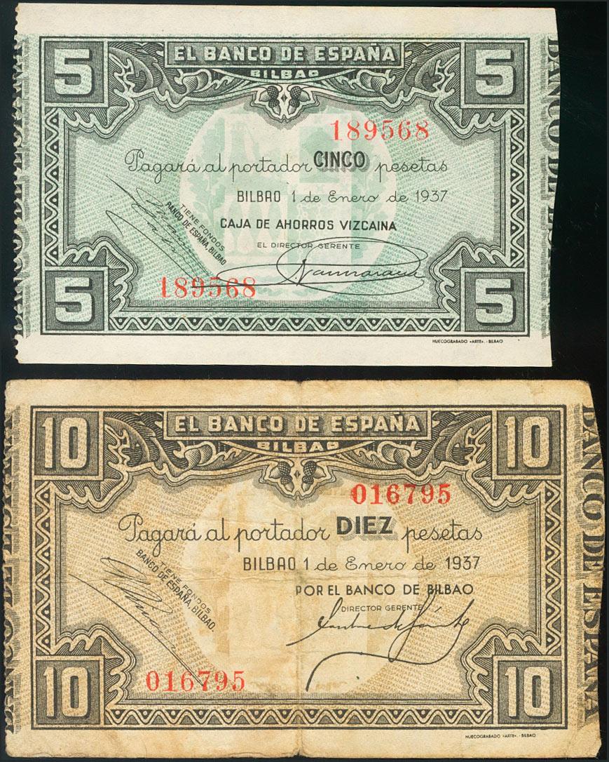 5 pesetas antefirma Caja de Ahorros Vizcaína, sin serie (Edifil 2017: 385b) EBC y 10 pesetas antefirma Banco de Bilbao, sin serie (Edifil 2017: 387a) BC. 1 de Enero de 1937.