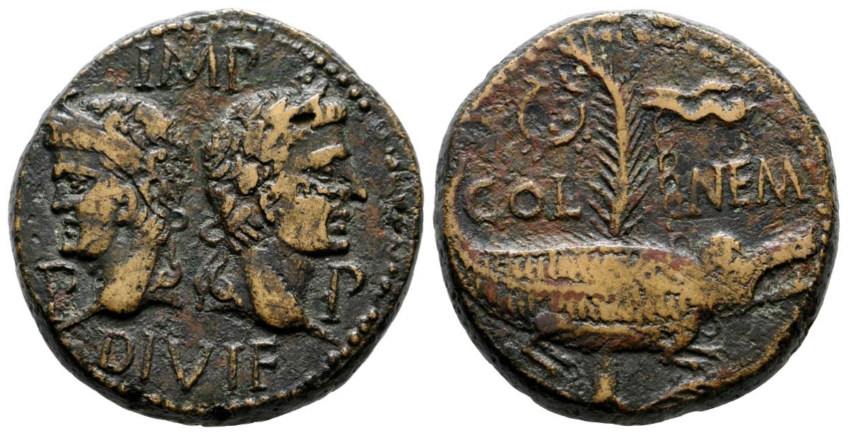 COLONIA AUGUSTA NEMASUS. As. 10-14 d.C. A/ Cabezas laureadas de Augusto y Agripa, a los lados. P-P. IMP. DIVI F. R/ Cocodrilo a derecha encadenado a una palmera y sobre esta a izquierda corona, a ambos lados COL-NEM. RIC-158. Ae. 13,22g. MBC.