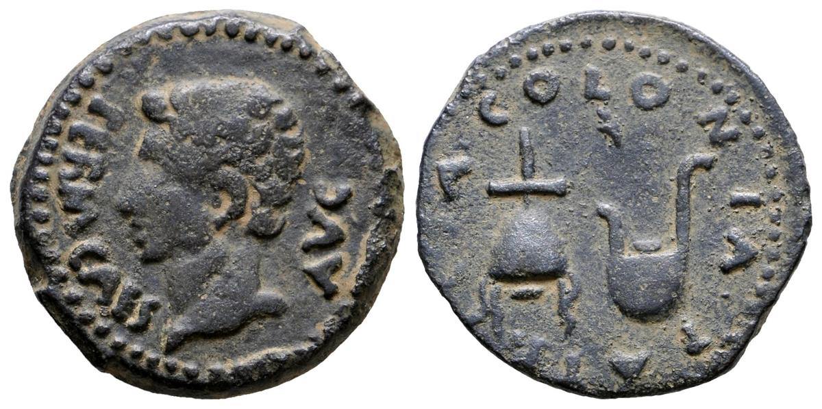 COLONIA PATRICIA. Semis. Epoca de Augusto. 27 a.C.-14 d.C. Córdoba. A/ Cabeza de Augusto a izquierda alrededor leyenda externa PERM CAES AVG. R/ Apex y simpulum, alrededor leyenda interna COLONIA PATRICIA. FAB-1992. Ae. 4,88g. MBC+.