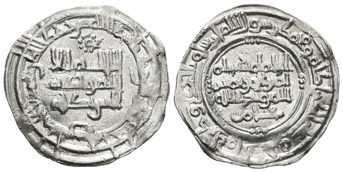 CALIFATO DE CORDOBA. Hisham II. Dirham. 381 H. Al-Andalus. Inusual decoración lineal decorada con tres puntos y citando a ´Amir en la IIA. Vives 514. Ar. 2,93g. MBC+.