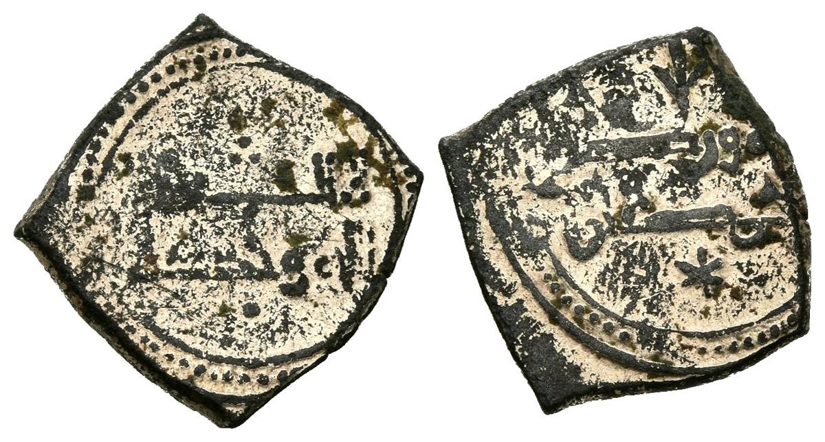TAIFA DE TOLEDO Y VALENCIA. Yahya Al-Ma´mun. Fracción de dinar. 435-467 H. Falsa de época en cobre dorado. Vives 1100; Prieto 335. Ae. 1,3g. MBC.
